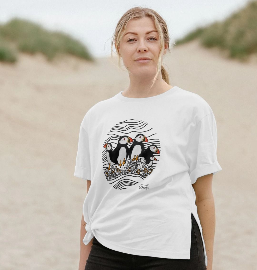 This Puffins Circus Relaxed Fit T-Shirt is crafted from 100% organic cotton with a relaxed fit for maximum comfort. Featuring side splits and roll sleeves, this T-Shirt adds a stylish touch to any look with a printed puffins colony motif. Designed for an effortless fit, this T-shirt is your go-to for everyday wear.